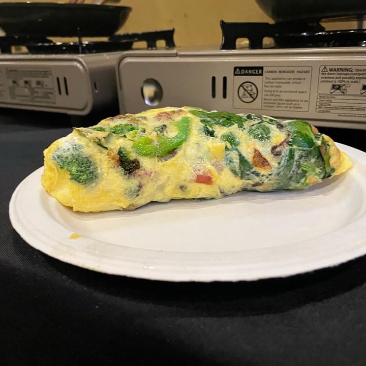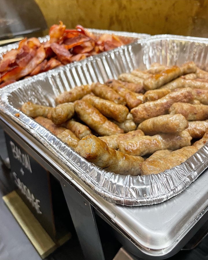 2 eggs, bacon, sausage, veggie sausage, hash browns